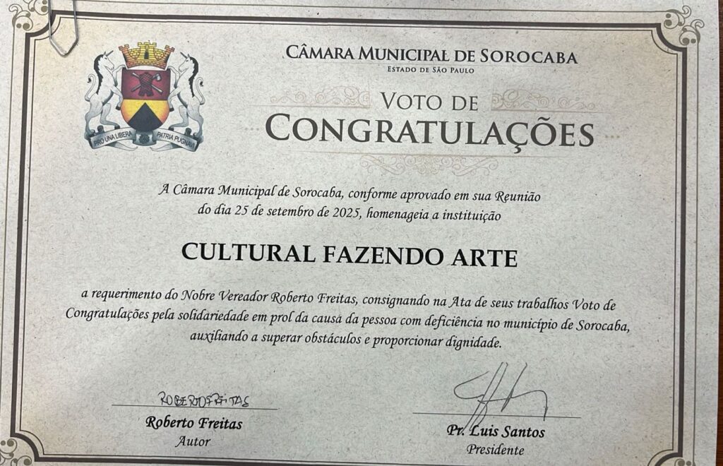 “A Fazendo Arte é um exemplo de como a cultura pode abrir portas, derrubar barreiras e promover inclusão. É uma honra reconhecer esse trabalho no Dia Nacional da Pessoa com Deficiência”.