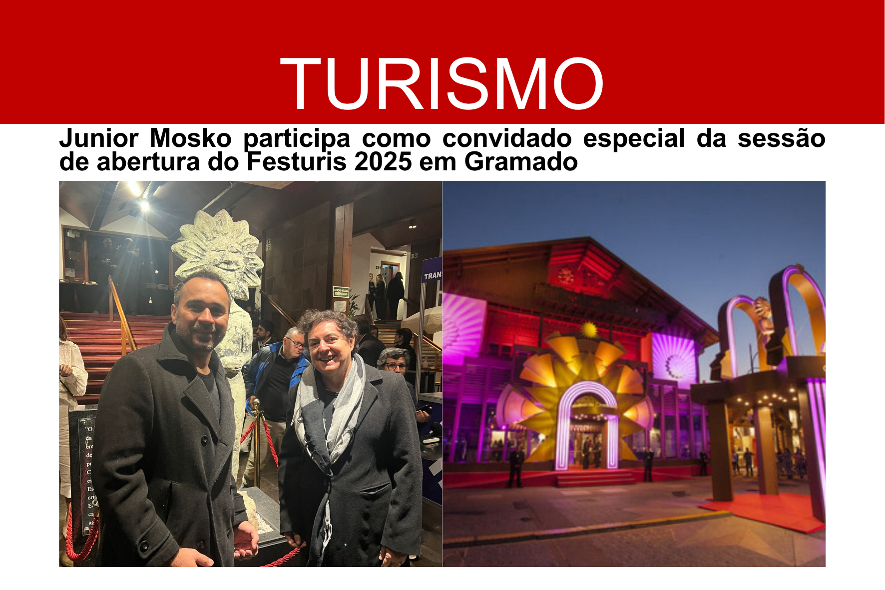 Gramado (RS), 6 de novembro de 2025 – A noite de abertura do Festuris Gramado – Feira Internacional de Turismo reuniu autoridades, lideranças do setor e personalidades da cultura no Palácio dos Festivais, em Gramado (RS). Entre os convidados especiais da cerimônia esteve o artista, diretor teatral e comunicador Júnior Mosko, que vem se destacando também no universo do turismo por seu trabalho à frente do programa “Viajando com Júnior Mosko”
