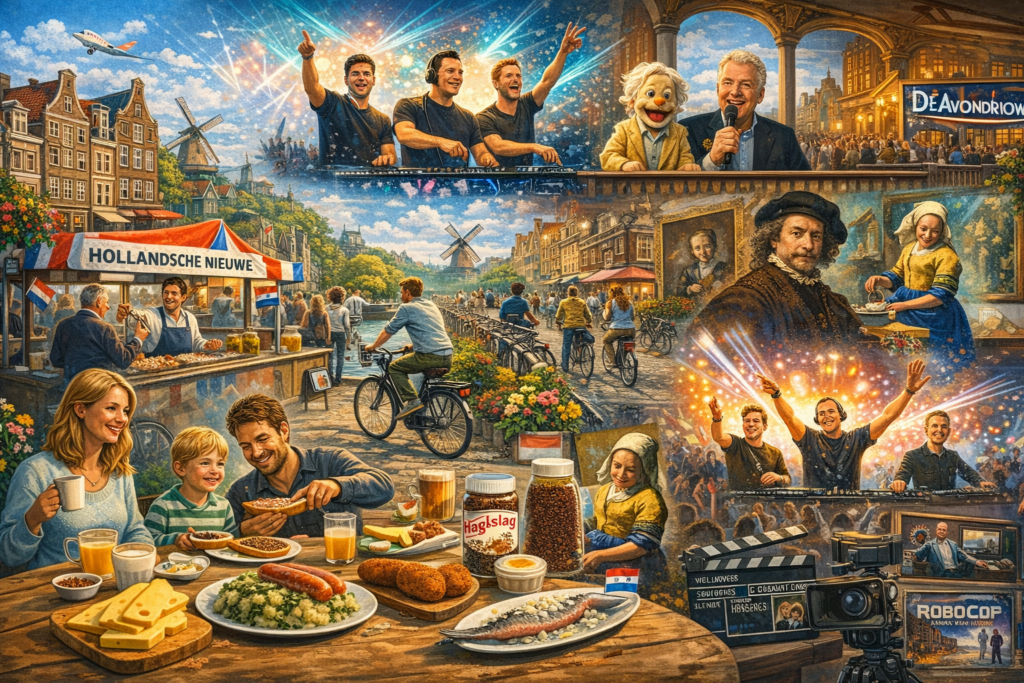 Entretenimento e Arte: A Holanda é terra de mestres. Na pintura, nomes como Van Gogh, Rembrandt e Vermeer são universais. Na música contemporânea, o país é uma potência da eletrônica, com DJs como Tiësto, Martin Garrix e Armin van Buuren. Na TV, programas de talentos e realities são populares, mas um ícone peculiar são os apresentadores do De Avondshow ou figuras do humor como André van Duin. No cinema, além dos festivais, diretores como Paul Verhoeven (Robocop, Instinto Selvagem) marcaram época em Hollywood.