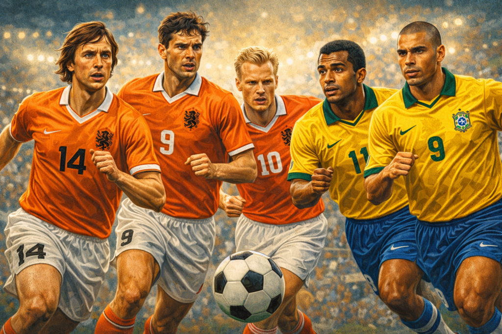A seleção holandesa, conhecida como Oranje (Laranja), tem uma história de três finais de Copa do Mundo (1974, 1978, 2010) sem vencer, o que lhe rendeu a fama de “freguesa de luxo” ou “zebra”, mas seus ídolos são inquestionáveis: